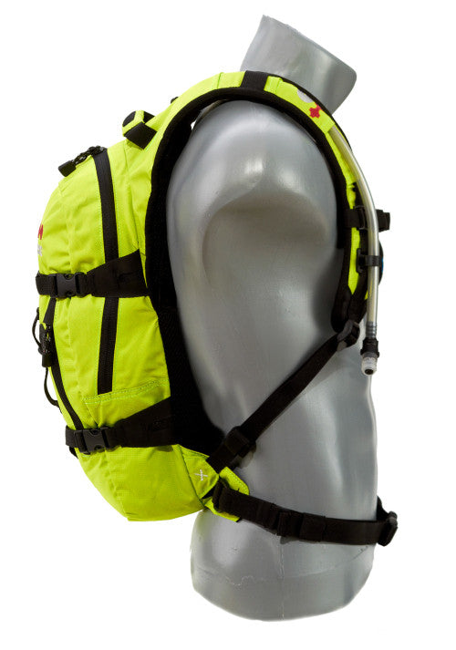 Additional Features: Plug & Play Reservoir Tube Connectors, 5 in by 7 in internal mesh pocket, able to hold a 3 Liter engine if desired, magnetic tube holder, adjustable (Velcro) power bulb holder, waffle mesh padding covered with breathable mesh for the should straps and back plate, adjustable chest strap (vertically and horizontally), emergency whistle on the chest strap.