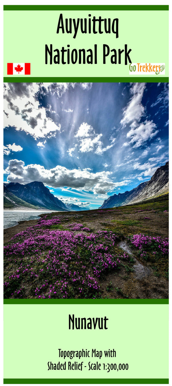 Folded custom printed map of Auyuittuq National Park in Nunavut, Canada. The only map series to cover Canada's Northern National Parks. This map is at 1:300,000 scale. Map shows Park Boundary, contours, rivers, Latitude/Longitude grid, scale bar, all with shaded relief colouring. Map size is approximately 41" x 24"