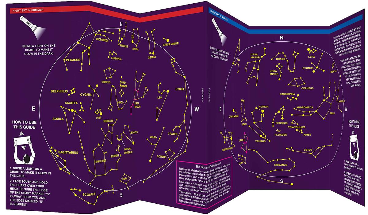 Learn about stars, our moon, planets (visible with the naked eye), eclipses, meteor showers, and other celestial events with this engaging, portable guide The Night Sky. It cuts through the clutter and offers simplified descriptions of the wonders of the universe that can be easily observed by the average person. There is also a handy insert about how to measure degrees using your fist and fingers. Both summer and winter star charts are included and, as an added bonus, they glow in the dark. All you have to do is shine a light on them (not in your eyes!) and they become illuminated. There is also additional background information on major constellations in both the summer and winter night sky. Laminated for durability, this lightweight, 12-panel folding pocket guide is the ideal companion for educators, learners, and amateur astronomers who wish to deepen their knowledge of the night sky in both summer and winter and connect more meaningfully with the spectacular phenomena of our precious galaxy. Made in the USA.